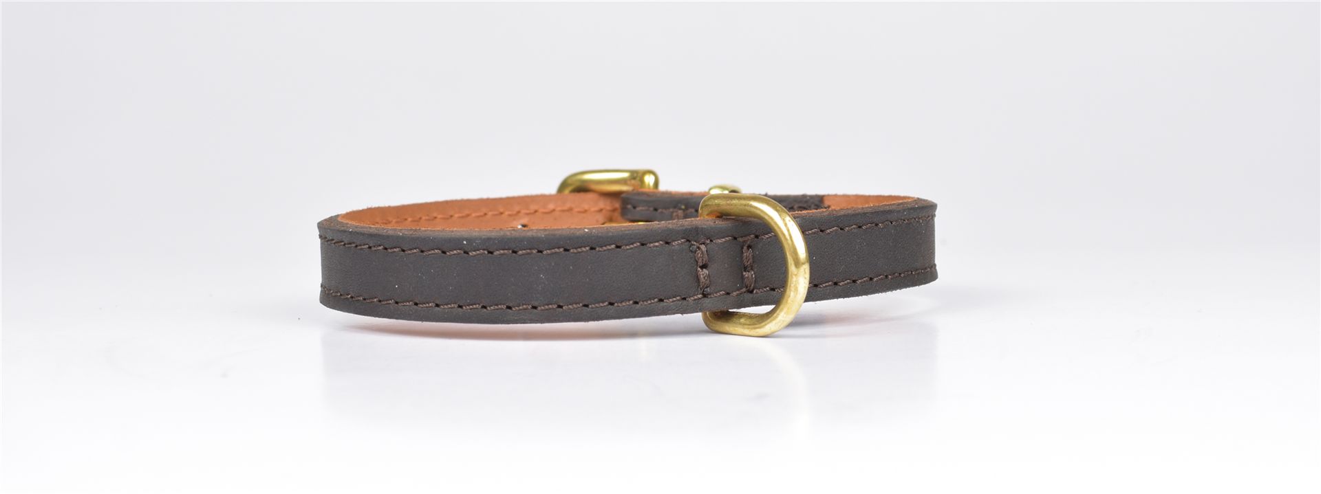 Hochwertige Halsbänder aus geschmeidigen, braunem Fettleder, genäht und unterlegt.