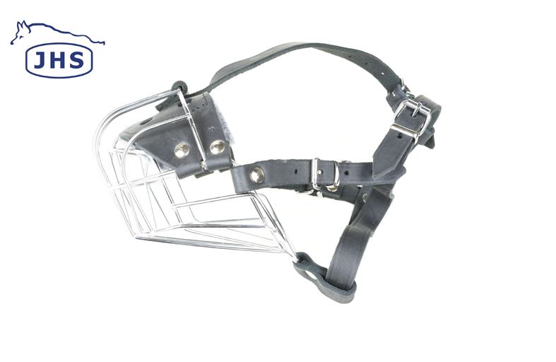 Metall Maulkorb ( Gitterkorb) , auf dem Nasenrücken ist mit weichem Filz gepolstert. Die Riemen sind aus echtem Fettleder.