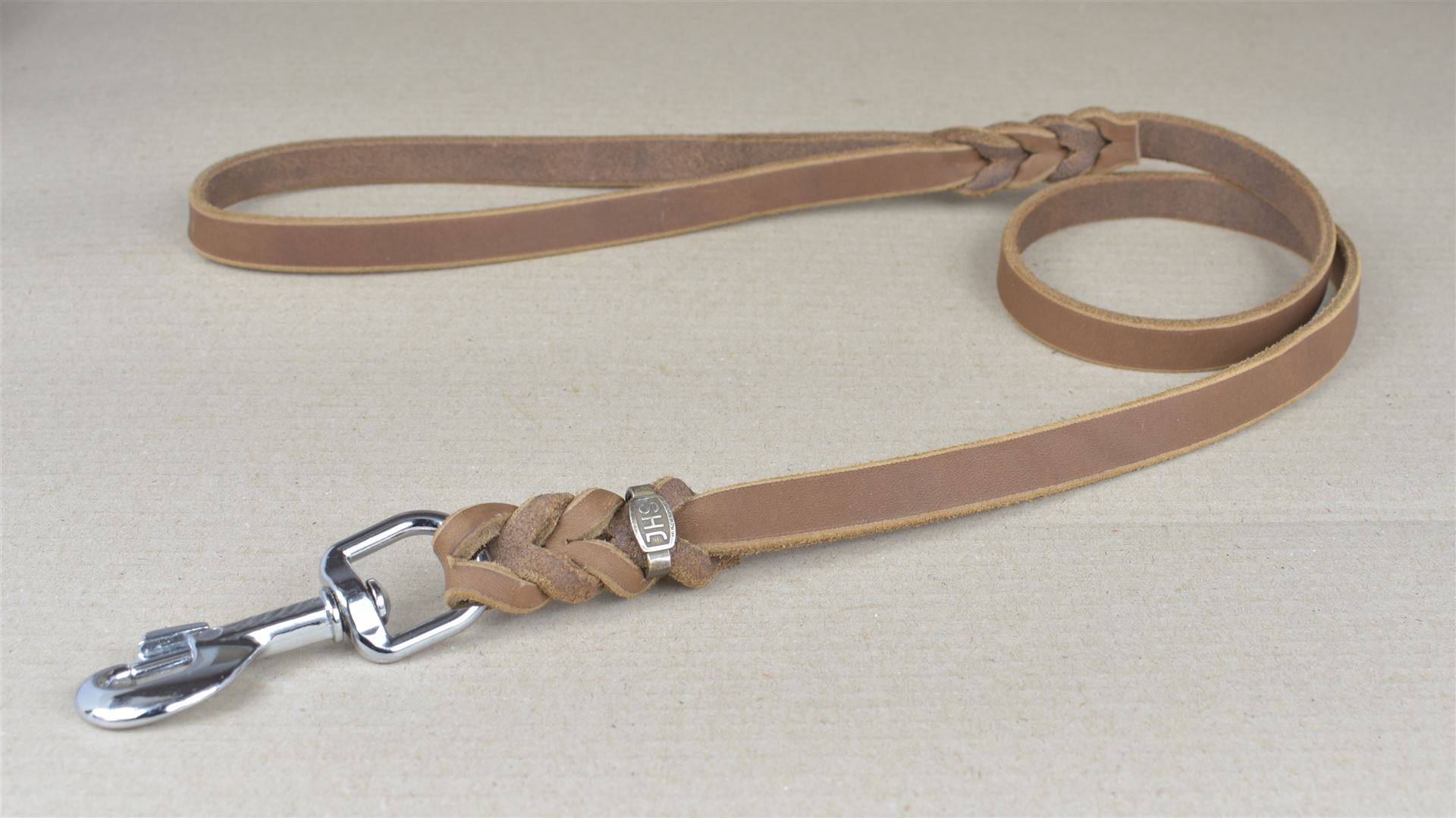 Lederleine aus Fettleder mit eingeflochtenem Karabinerhaken und Handschlaufe.