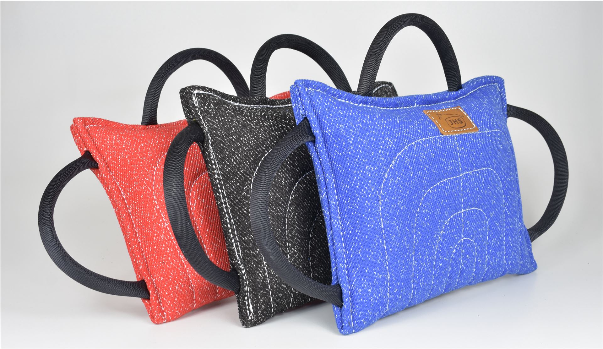 Klassisches Beißkissen mit 3 Griffschlaufen aus widerstandsfähigem Nylcott Material.