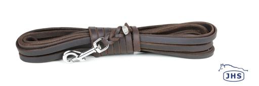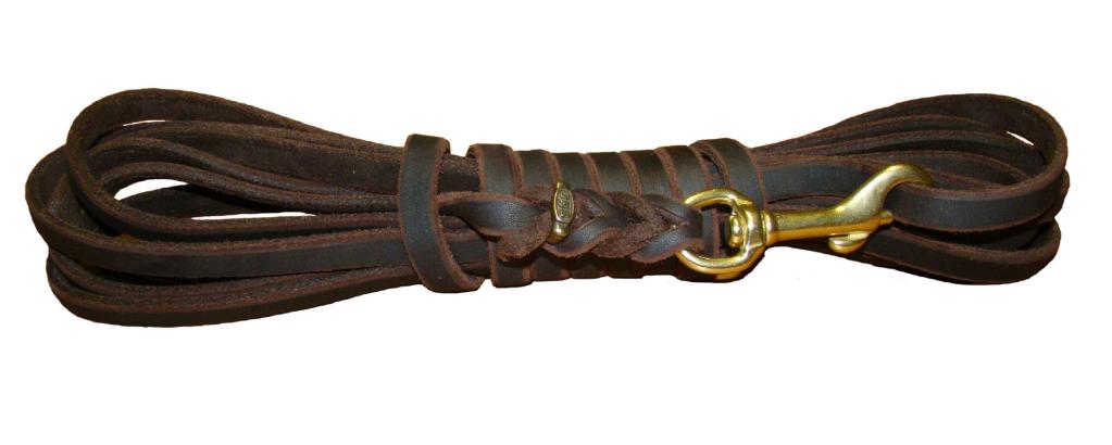 Ledersuchleinen aus Fettleder, aus einem Stück gefertig, mit eingeflochtener Handschlaufe und Karabinerhaken.
